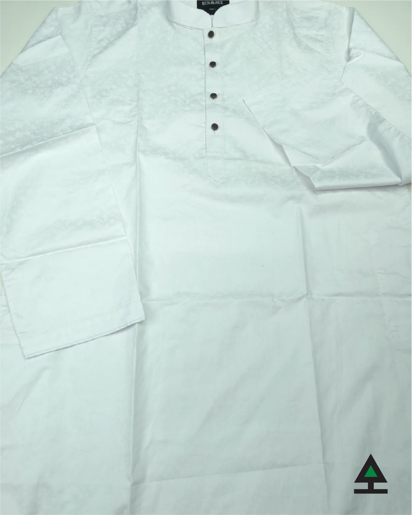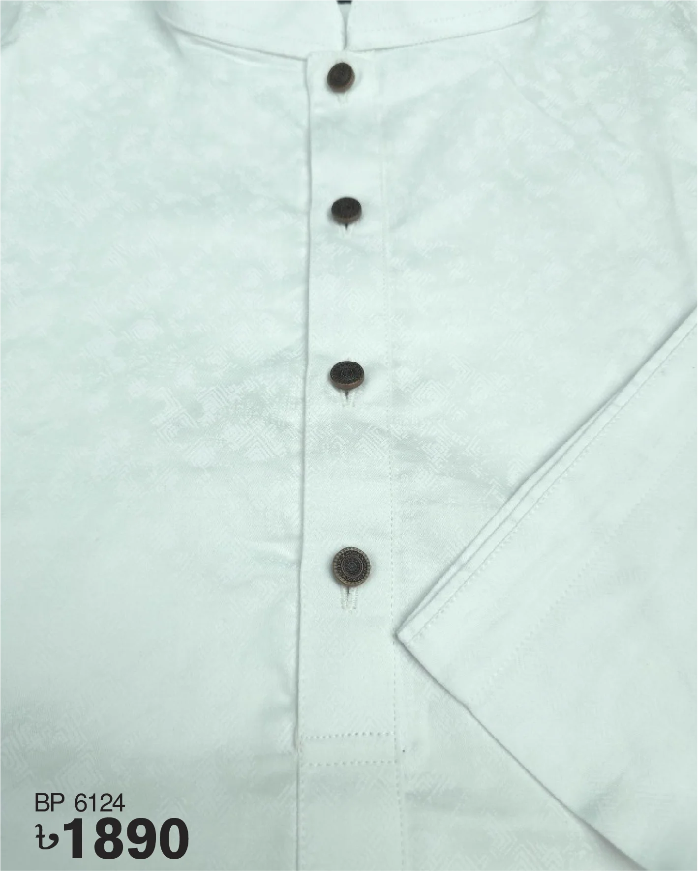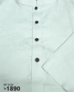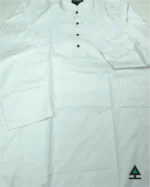 White panjabi with on color patterns on whole body. Metal button on the plate adds an ethnic look to it.