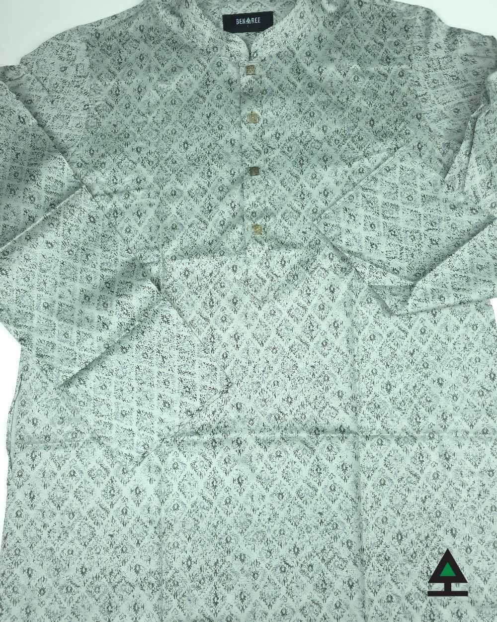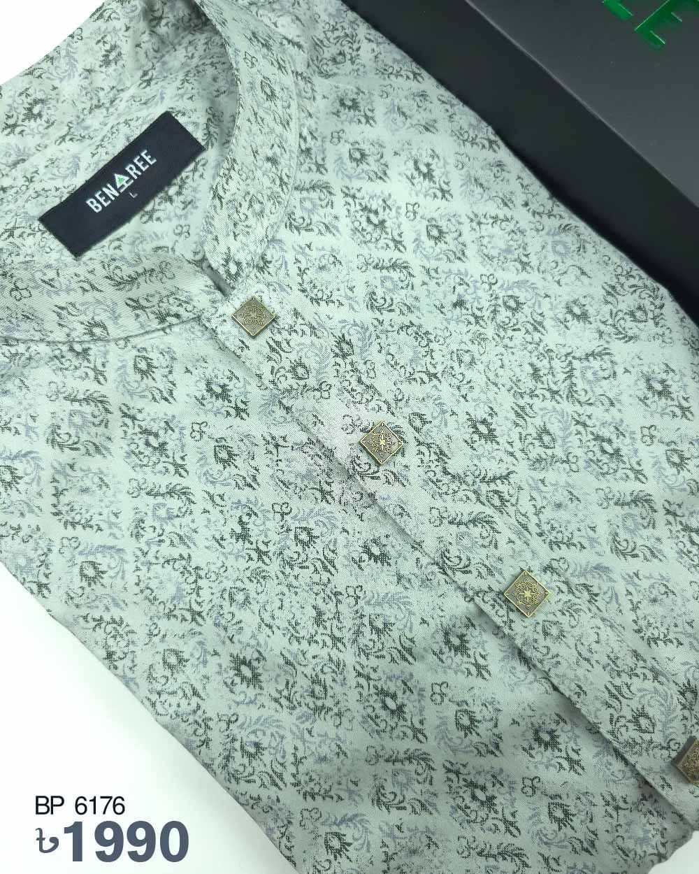 Consistent printed work on dark color panjabi. Metal push button to complement the design.