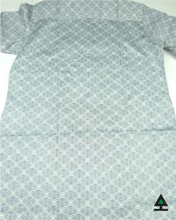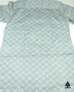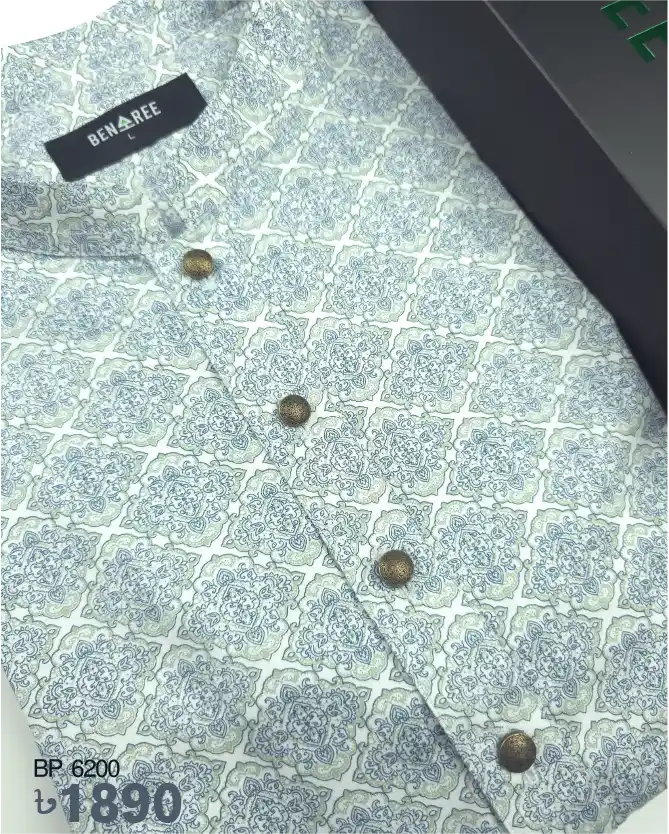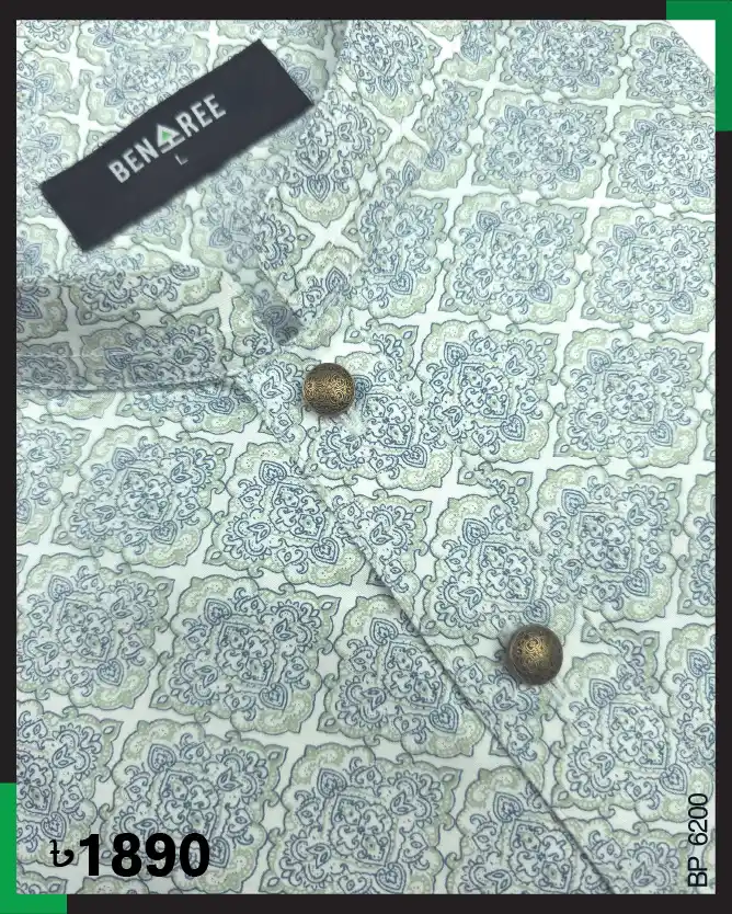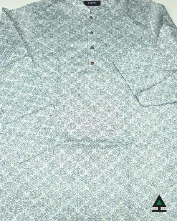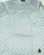All body ethnic algae green & blue print on white color panjabi. Metal button to complement the pattern work of the body.