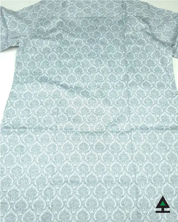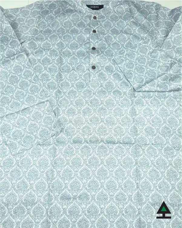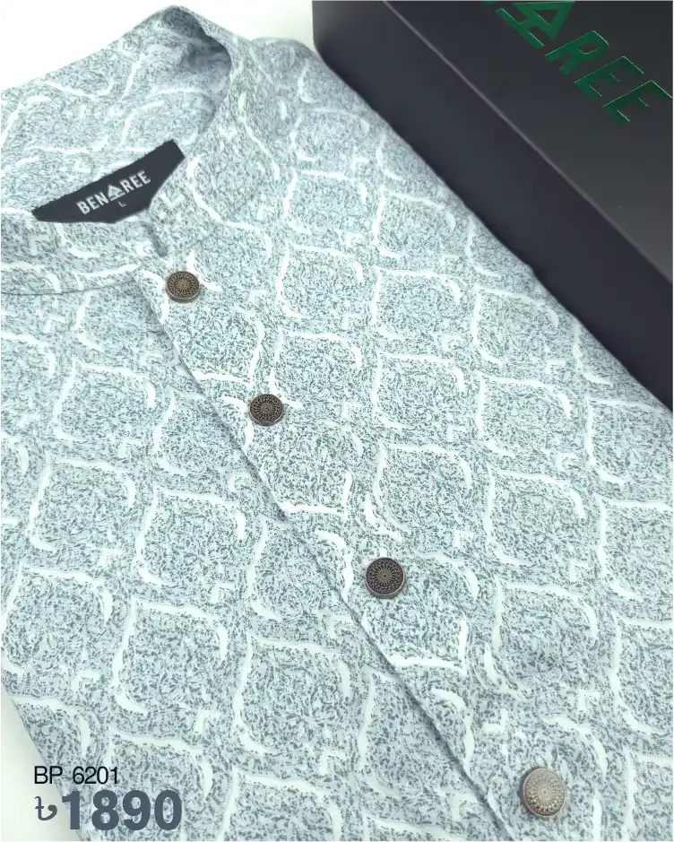All body ethnic print on light blue color panjabi. Metal push button to complement the pattern work of the body.