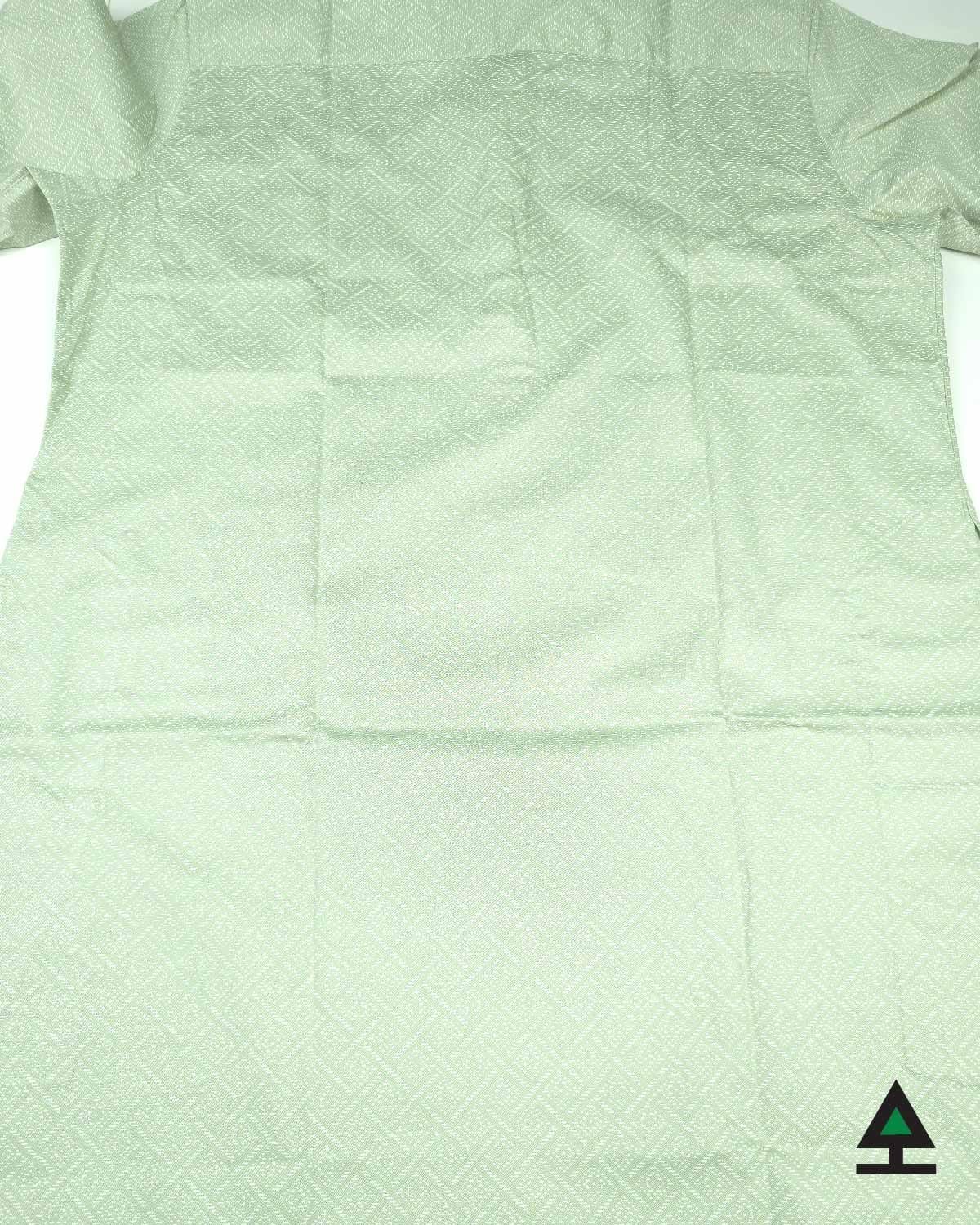 Consistent white printed box on whole mythic green body. Rustic button with the pattern.
