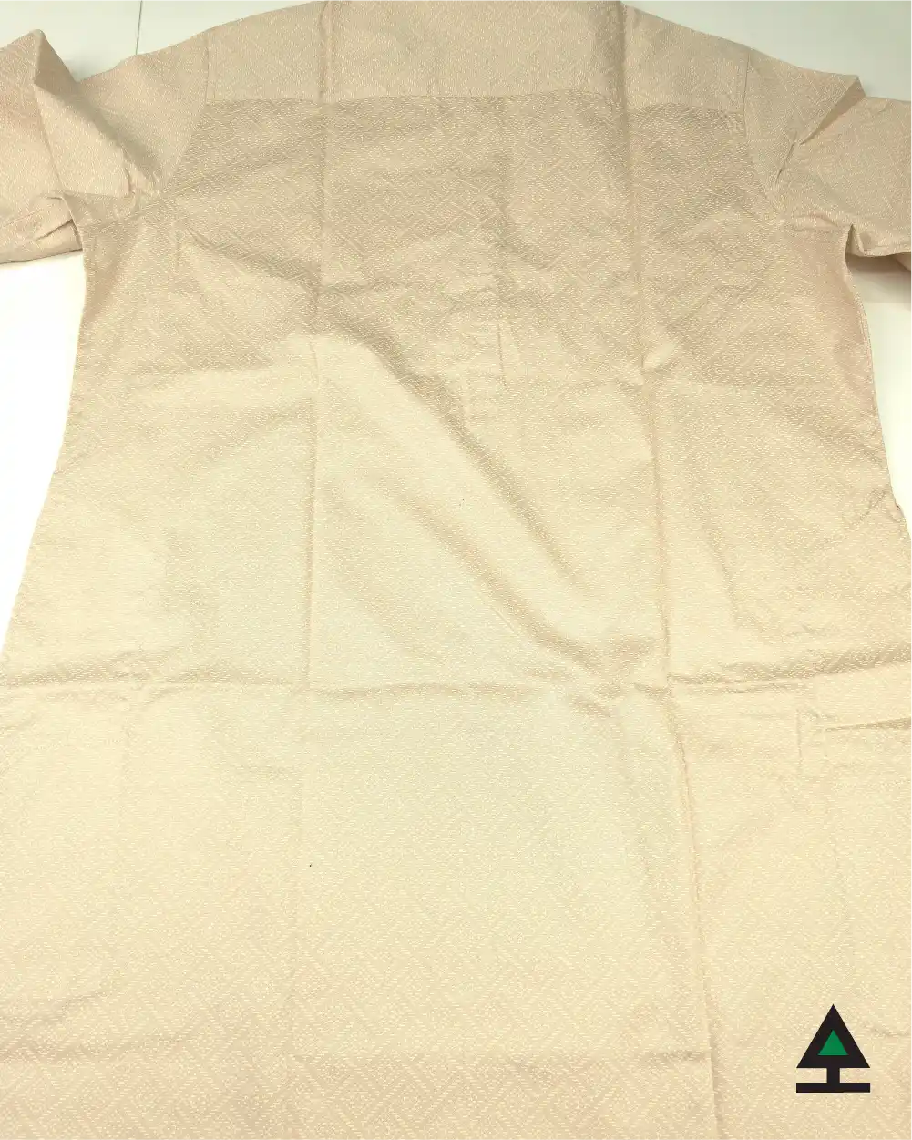 Consistent white printed box on whole light biscuit color body. Rustic button with the pattern.