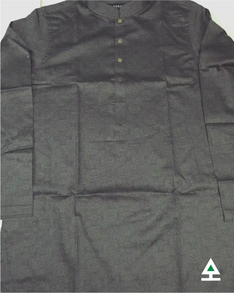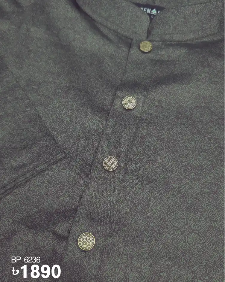 All over print in deep green color panjabi. Push button which stands out in the plate.