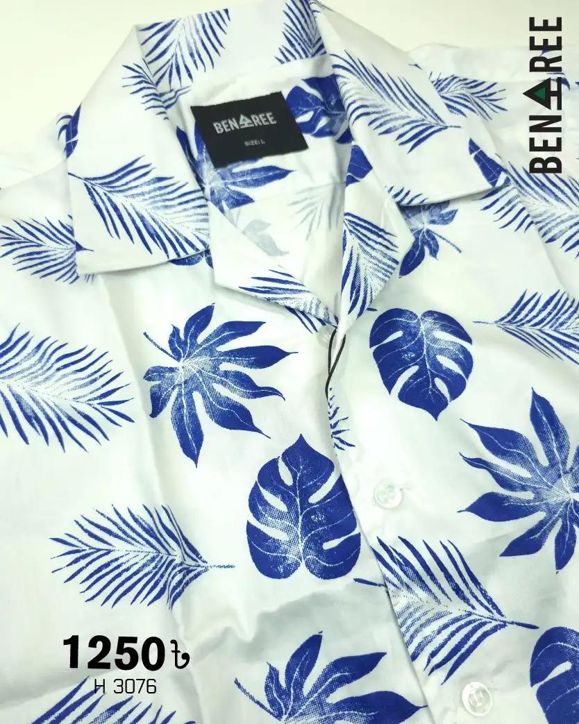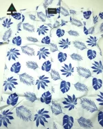 Blue leaf print on white color printed cuban collar half shirt.