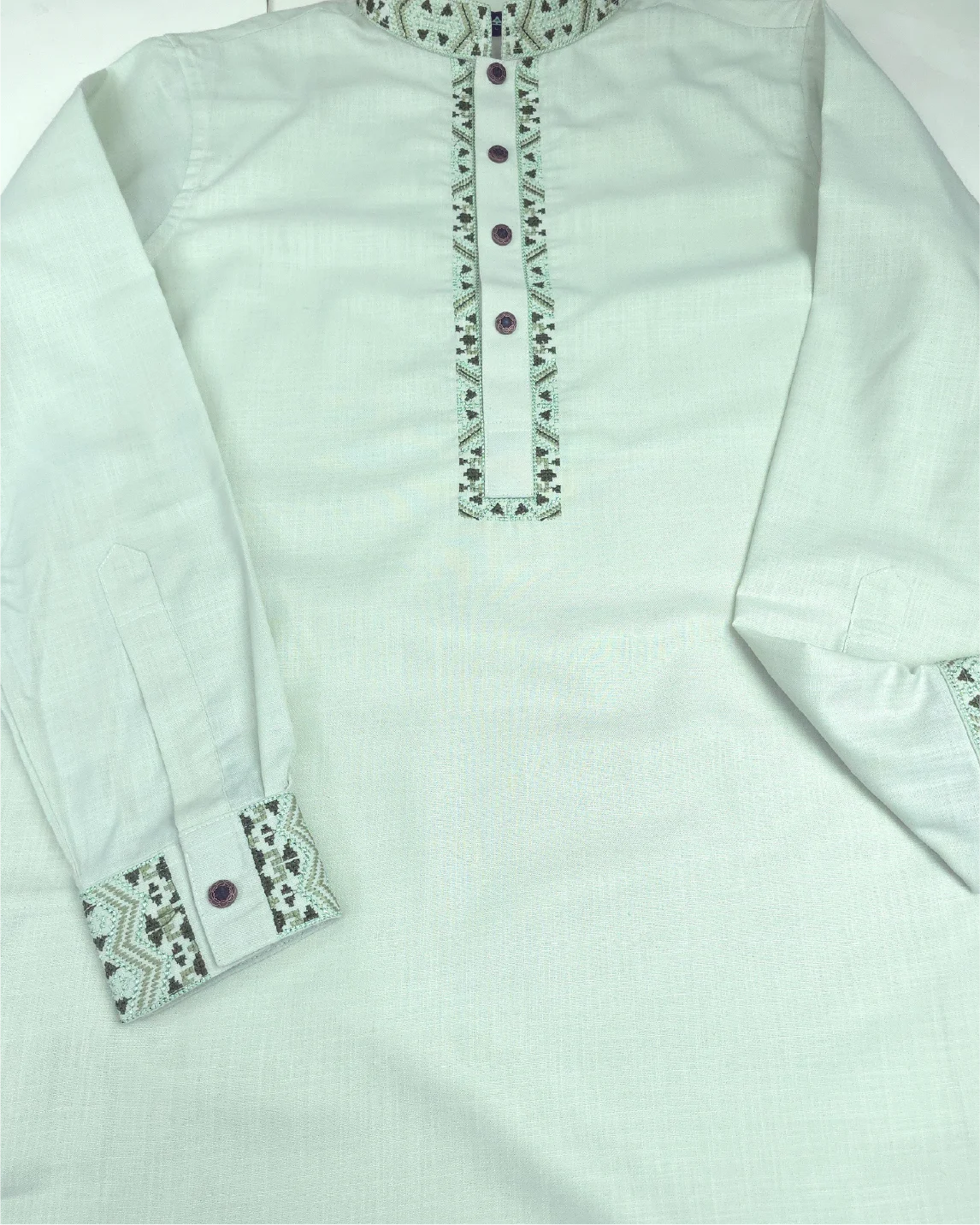 This Panjabi features tasteful embroidery on the neckline and cuff area, adding a touch of clean craftsmanship without overpowering the design.