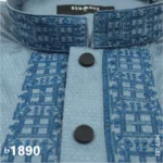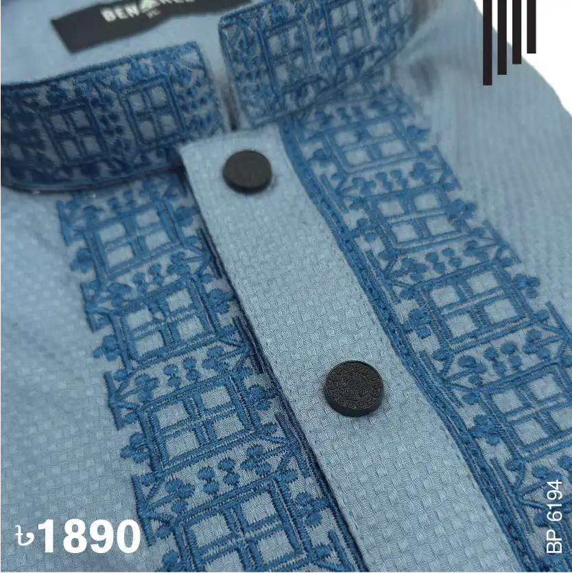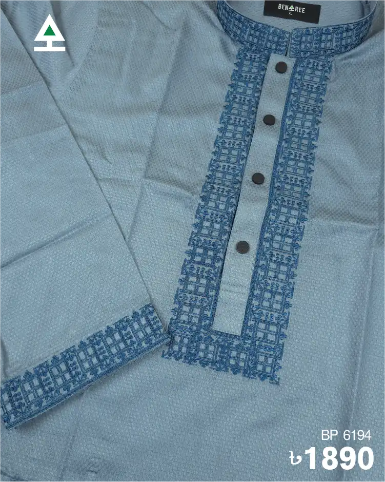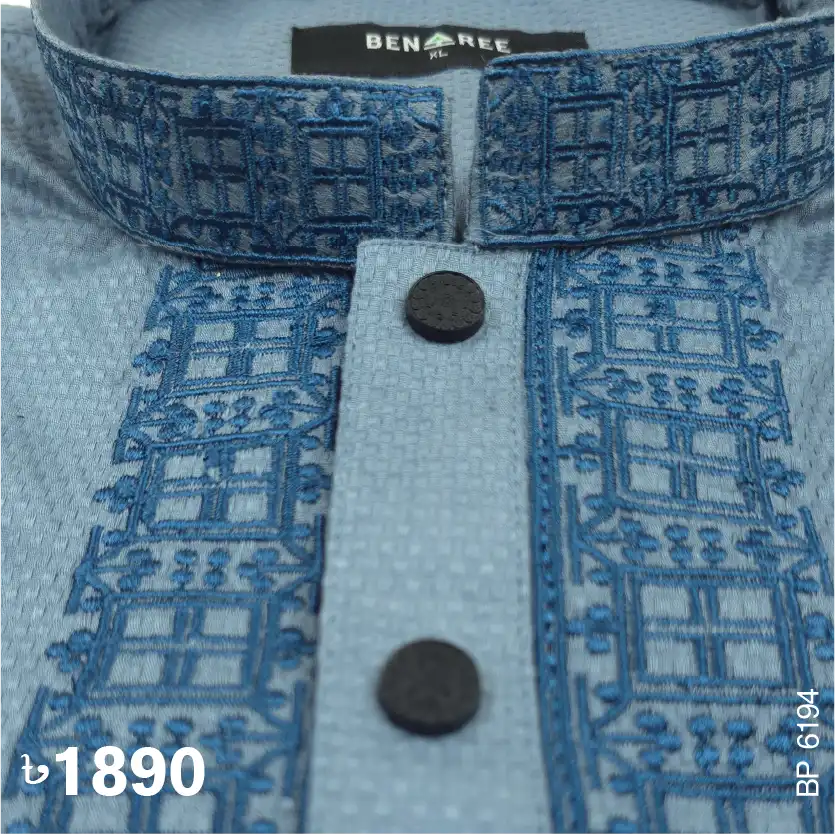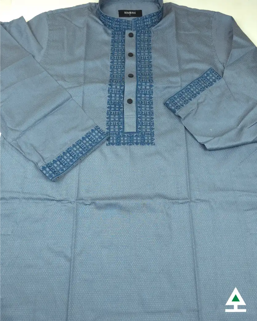 Fine embroidery on neck, cuff & plate of Steel Blue color Panjabi. Push button to complement the design.