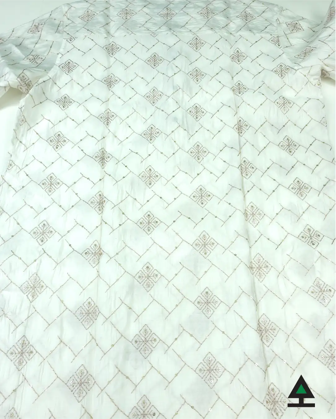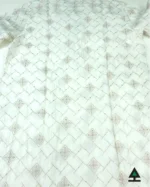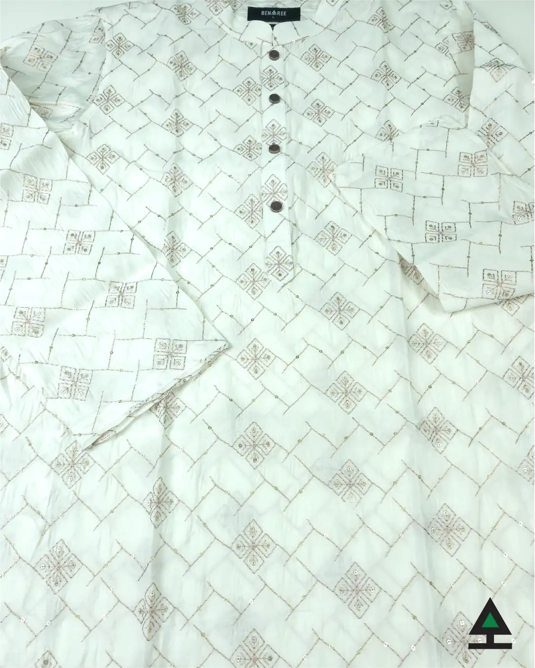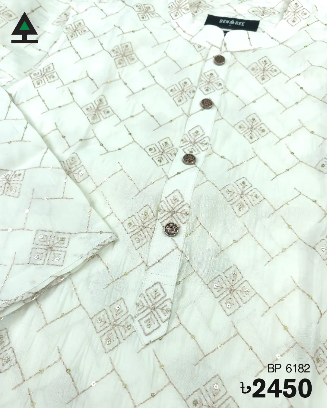Elegant work of premium yarn on off white sequin fabric. Fancy metal push button to contain the energy of your panjabi.