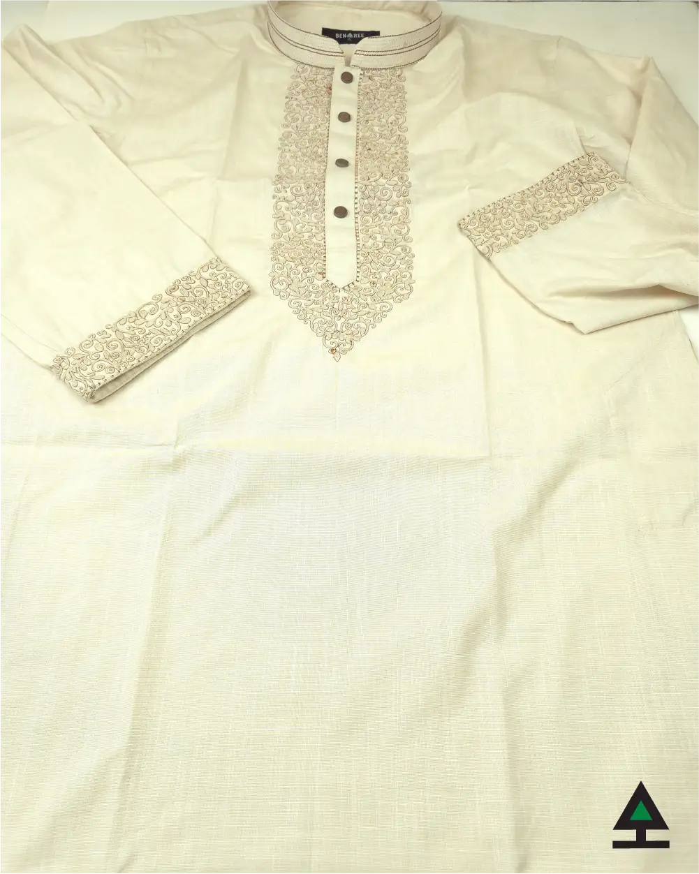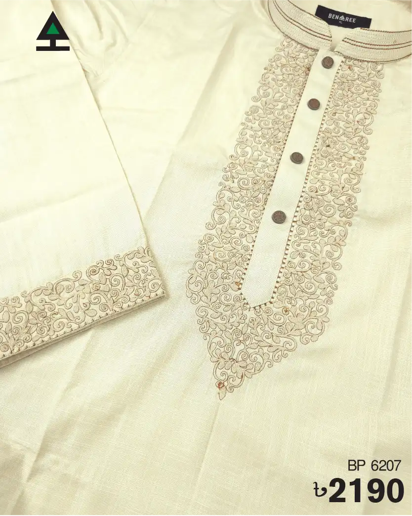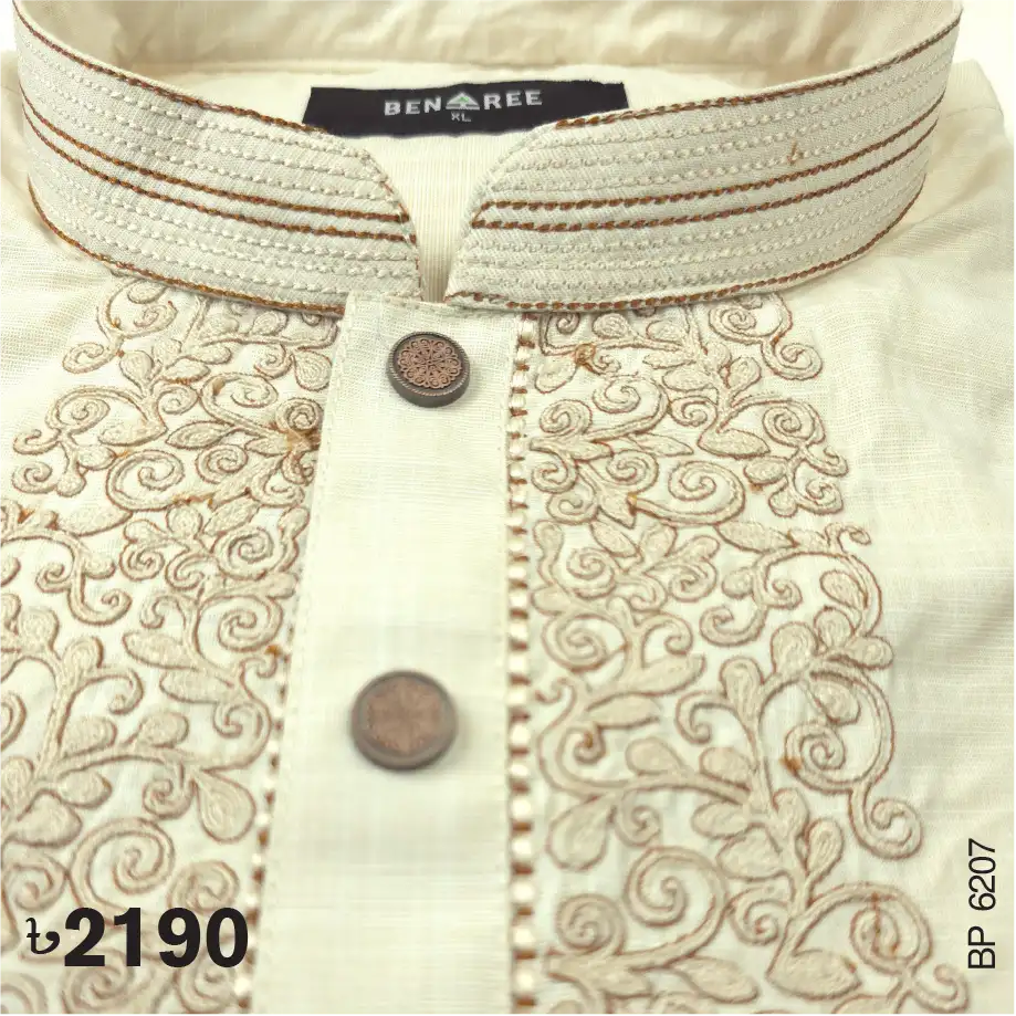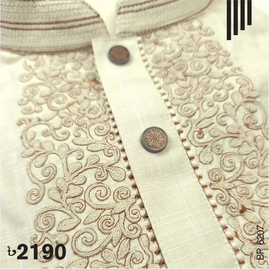 Fine embroidery on neck, cuff & plate of Biscuit color Panjabi. Push button to complement the design.