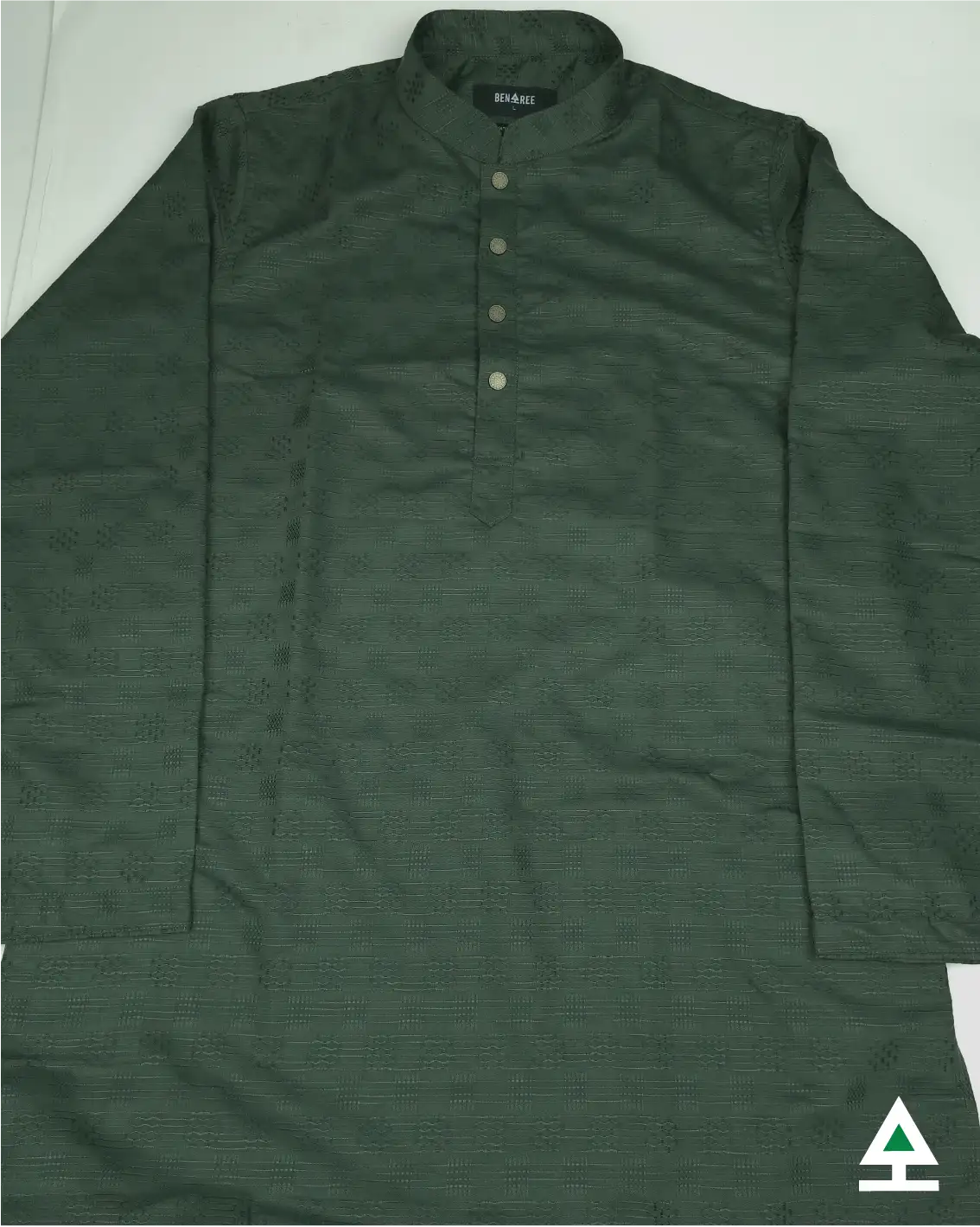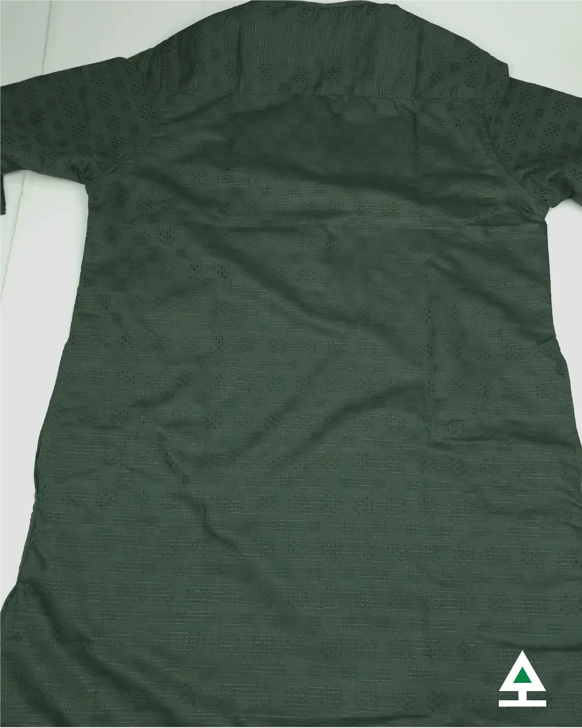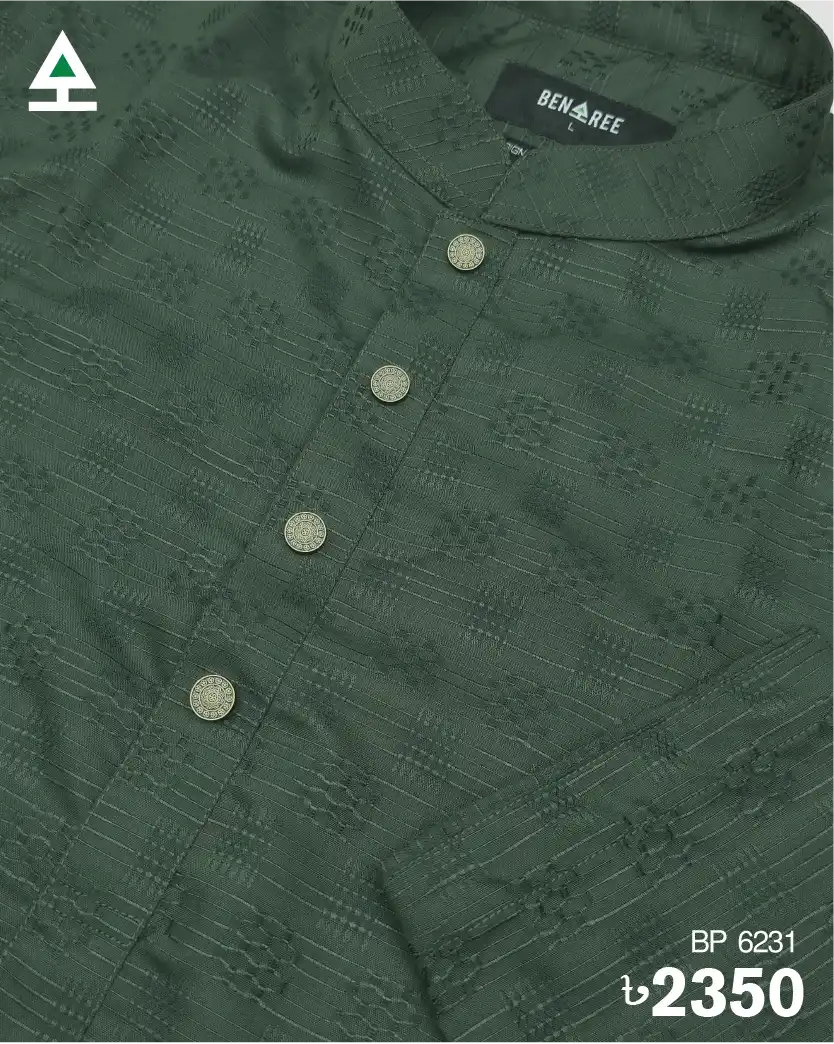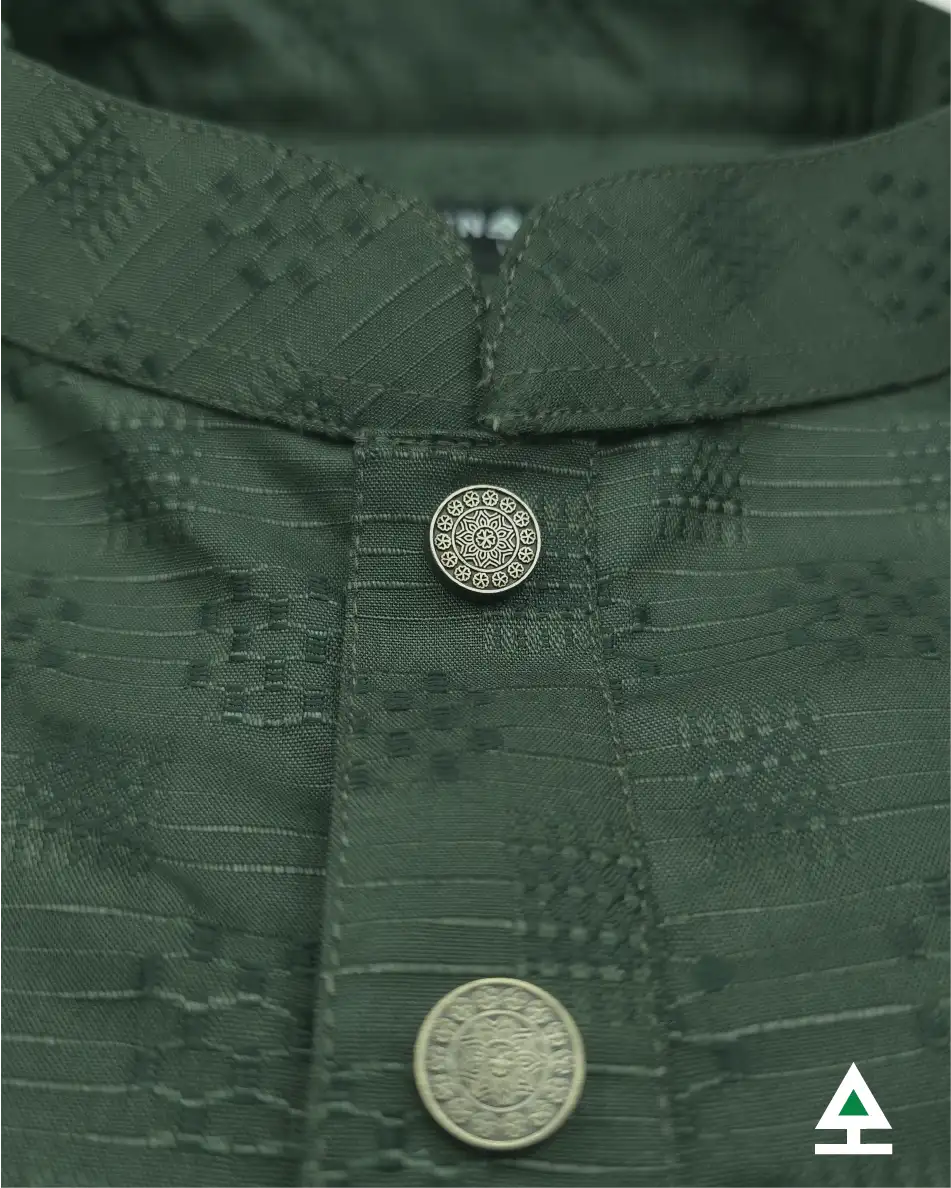 Sophisticated on color design on deep green color panjabi. Metal push button on the plates.