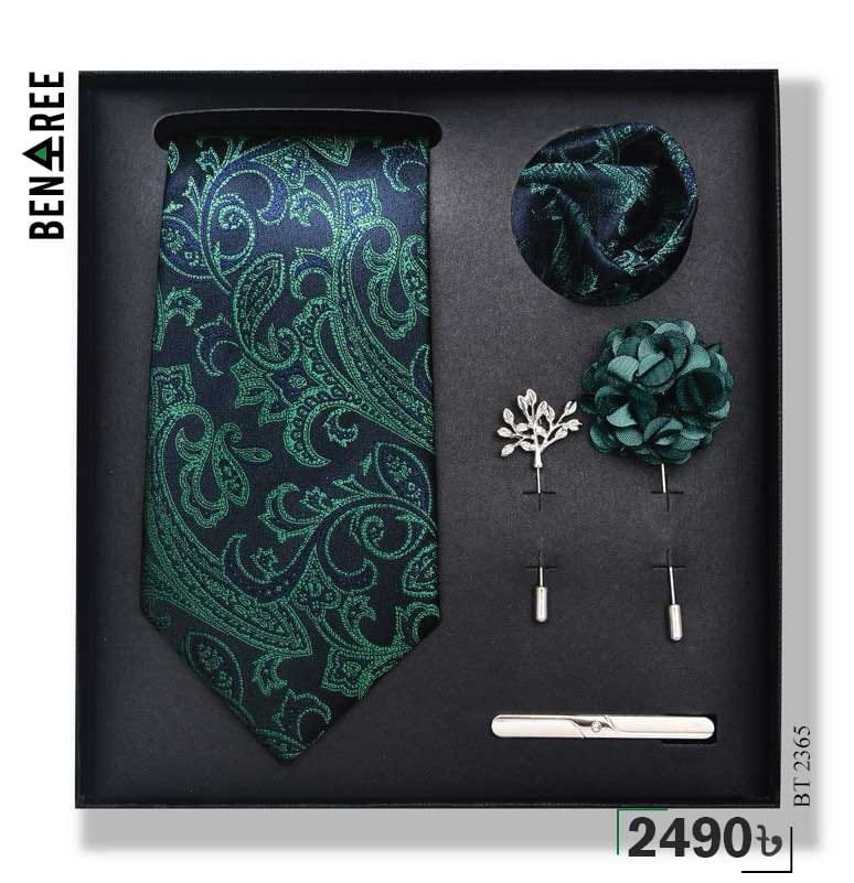 1 pc neck tie, 1 pocket square, 1 pair cufflinks, 1 tie clip